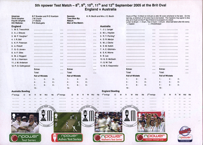 We are also preparing some scorecards as shown below from various days of the last test. These will be cancelled with the SE11 first day of issue postmark, and are priced to existing customers is £11.75 - again, please reserve these now, using the link above.