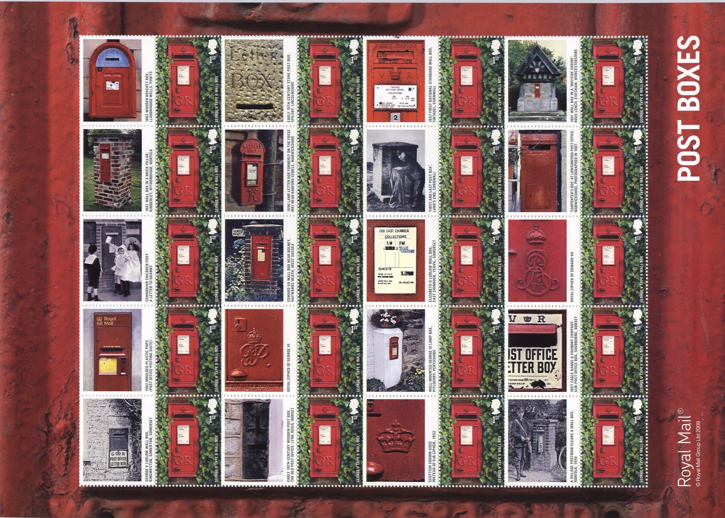 A generic sheet consisting of 20 x 1st class Postbox stamps from the miniature sheet, with 20 labels depicting postboxes or details from them.