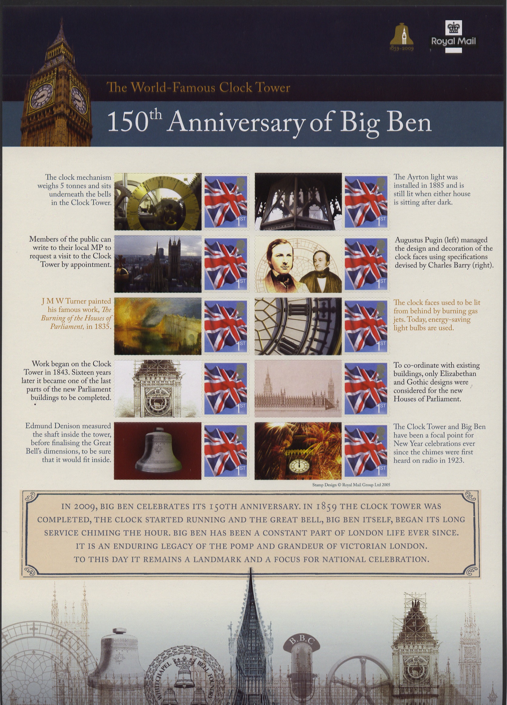 Royal Mail marks the 150th Anniversary of the Westminster clock tower known as "Big Ben". It was actually the great bell that was named after the popular parliamentarian Sir Benjamin Hall, but the nickname quickly became associated with the tower. The clock, great bell and four quarter bells first worked together in September 1859. Read more on wikipedia.